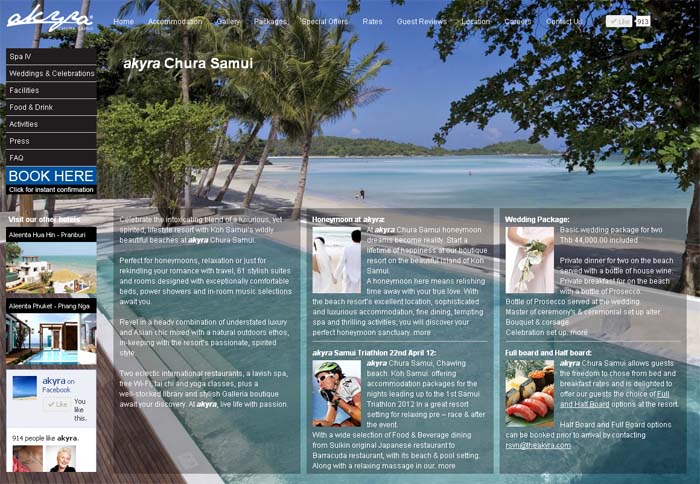 Klint & Co developed the akyra web design and focus was on the visual wonders of the resort combined with easy access to all relevant information - highly visually presented.